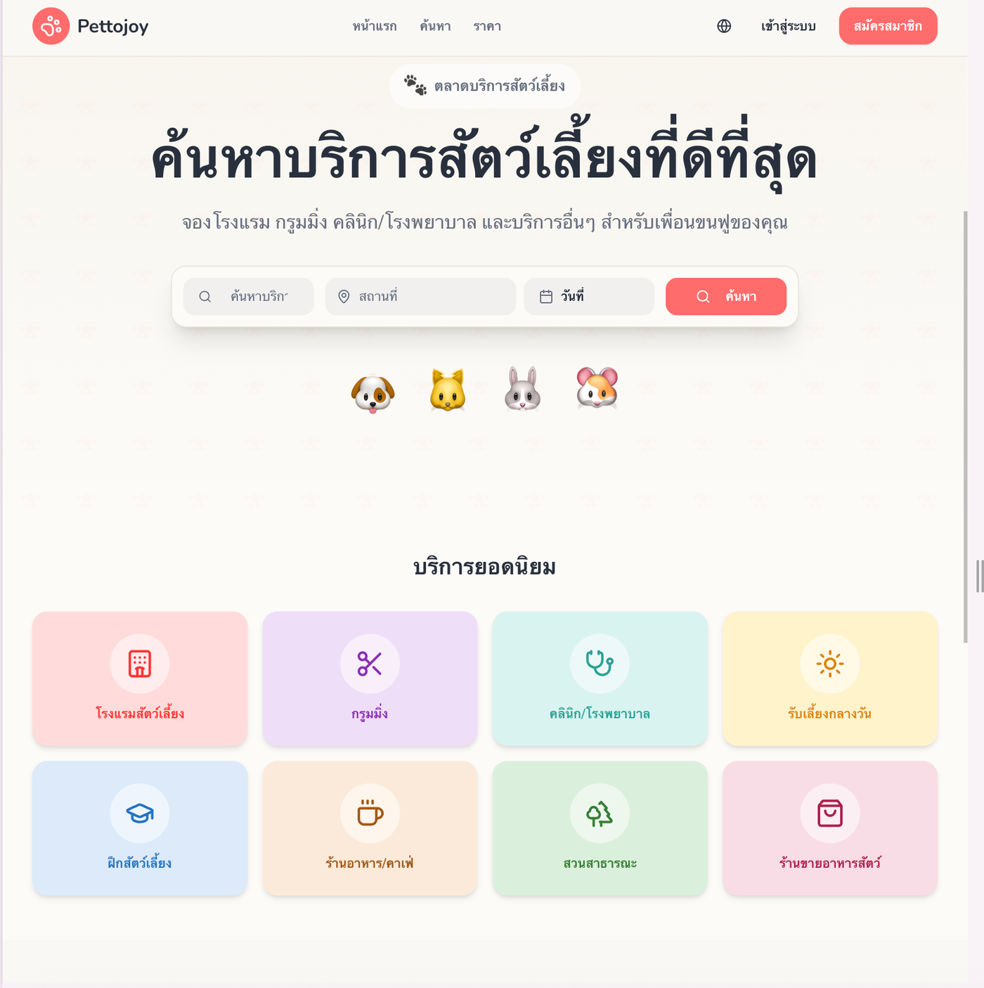 ทางทีม ขอแนะนำ PettoJoy (pettojoy.com) แพลตฟอร์มตลาดบริการสัตว์เลี้ยง ที่ช่วยเชื่อมต่อเจ้าของสัตว์เลี้ยงกับคลินิก โรงพยาบาลสัตว์ และโรงแรมสัตว์เลี้ยง ให้เข้าถึงลูกค้าได้ง่ายขึ้น เพิ่มโอกาสในการให้บริการ และจัดการงานได้สะดวกในระบบเดียว